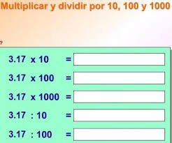 En este enlace practicarás la división entre la unidad seguida de ceros. Y de paso, multiplicarás también por 10, 100, 1000...